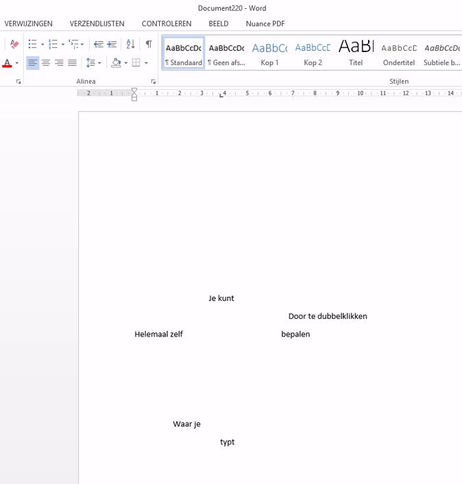 Word leent zich van oudsher niet zo goed voor brainstormsessies, immers, tekst moet allemaal geordend zijn en je kunt niet zomaar midden in een pagina een woord plaatsen...toch? Dat is lange tijd inderdaad zo geweest, maar tegenwoordig is Word een stuk slimmer. Wist je namelijk dat je op een willekeurige plek in een Word-document kunt dubbelklikken en kunt beginnen met typen? Niets geen tabs of inspringingen, gewoon zelf bepalen waar je begint.