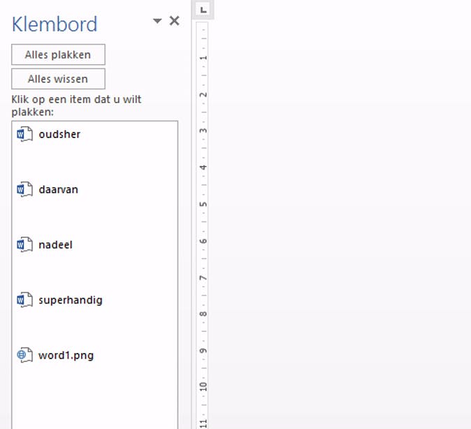 Het klembord is handig, maar het is wel irritant dat je maar één item per keer daarin kunt kopiëren. Dan is het goed om te weten dat je een uitgebreid klembord in kunt schakelen. Om dit te doen klik je in het tabblad Start op het kleine vierkantje met het pijltje naast Klembord. Er opent nu een Klembord-venster, en elke keer dat je nu iets kopieert, komt dat in dit klembord te staan. Je kunt zo maar liefst 24 items in het klembord bewaren.