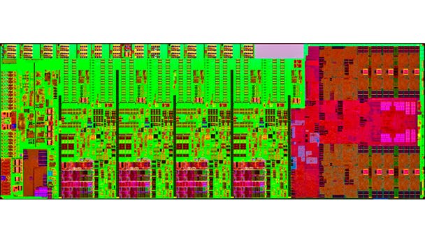 We kunnen duidelijk de vier processor-cores en de grafische core (rechts) onderscheiden.
