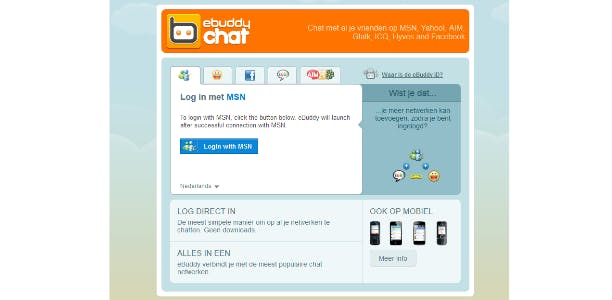 Het voordeel van deze dienst is dat het vrijwel alle functies heeft die Live Messenger had, zonder dat je er een programma voor moet downloaden. Je logt simpelweg online in met je Microsoft-account. Groot voordeel aan eBuddy ten opzichte van Live Messenger is ook nog eens dat het voor verschillende mobiele platformen beschikbaar is. Nadeel is natuurlijk dat het aantal gebruikers van de chatdienst rap afneemt, nu Microsoft het niet meer ondersteunt, dus uiteindelijk zal je alsnog naar iets anders moeten zoeken.