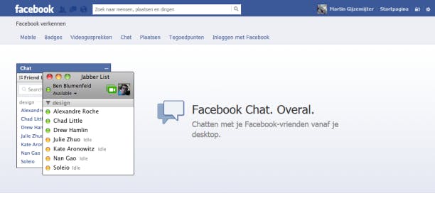 Nog zo’n multiplatform-mogelijkheid om te chatten! Chatten via Facebook is handig, omdat je de site in principe gewoon open kunt laten staan en zo de hele dag berichten kunt ontvangen, ook wanneer je andere dingen doet op Facebook. Daarnaast heeft Facebook voor alle mobiele platformen een app (niet alleen voor de site, maar ook specifiek voor de chat), waardoor je op vrijwel elk willekeurig apparaat kunt chatten met je Facebook vrienden.