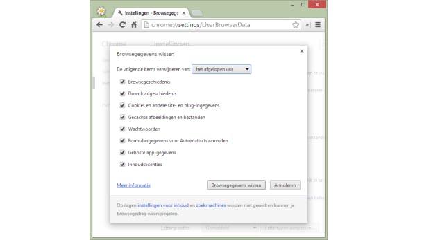 Je browser onthoudt veel gegevens en informatie tijdens het internetten, bijvoorbeeld op welke websites je bent geweest (en wanneer), wachtwoorden en ingevulde formulieren. Deze 'internet-cache' kun je eenvoudig legen. In Chrome, Internet Explorer en Firefox roep je met toetscombinatie Ctrl+Shift+Del een schoonmaakhulp op. Er verschijnt een keuzescherm waarin je kunt aangeven welke gegevens je wilt verwijderen. Geef bijvoorbeeld aan dat je de geschiedenis wilt verwijderen, maar dat je je wachtwoorden wilt houden. Bij sommige browsers kun je de schoonmaakhulp selectief inzetten voor een bepaalde tijd en zo alleen de gegevens van het afgelopen uur (of dag) opschonen.