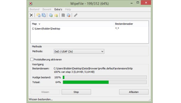 Als je bestanden verwijdert via de prullenbak, zijn de bestanden mogelijk nog terug te halen. Als je bestanden definitief wilt verwijderen, kun je een bestandsshredder als WipeFile gebruiken. Hierbij wordt de schijfruimte waar het bestand was opgeslagen, meerdere keren overschreven. Kies eventueel de Nederlandse taal via het menu Extra / Language. Sleep de bestanden of mappen die je wilt vernietigen naar het WipeFile-venster. Kies de 'sterkte' van de bestandsshredder bij Methode en bevestig met Wissen. Let op: gebruik WipeFile met aandacht, want weg is echt weg!