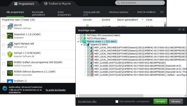 Activeer de optie Batch de-installeren. Je kunt nu meerdere programma's aanvinken om te verwijderen. Klik op de knop De-installeer om de programma's achtereenvolgens te laten de-installeren. Zodra het laatste programma uit je wachtrij is gede-installeerd, voert IObit Uninstaller een speuractie uit. Eventueel achtergebleven bestandsresten komen tevoorschijn waarna je deze kunt verwijderen.