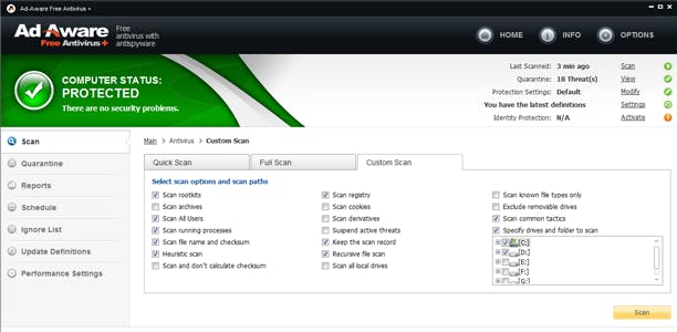 Naast de realtime bescherming voorziet Ad Aware in on-demand scans. Dat kan een (super)snelle scan van de meest gevoelige gebieden zijn, maar ook een complete scan. Beide laten zich trouwens ook inplannen. Een ‘custom scan’ is eveneens mogelijk, je bepaalt dan zelf wat er precies moet worden gescand en hoe intens Ad Aware daarbij de systeembronnen mag aanspreken. Ad Aware nestelt zich in het contextmenu van de Windows Verkenner, zodat je ook van daaruit een scan van een bestand of map kunt starten.