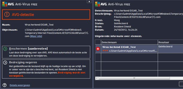 AVG in het verweer tegen het EICAR-testvirus.