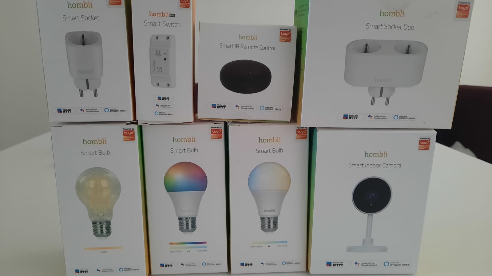 Het huidige assortiment van Hombli bestaat uit een RGB & CTT-, CTT- en Filament-lamp, een GU10 RGB & WW- en CCT-Spot, deurbel, outdoor camera en led strip. De producten zijn te verkrijgen via webshops als Coolblue en Bol.com.