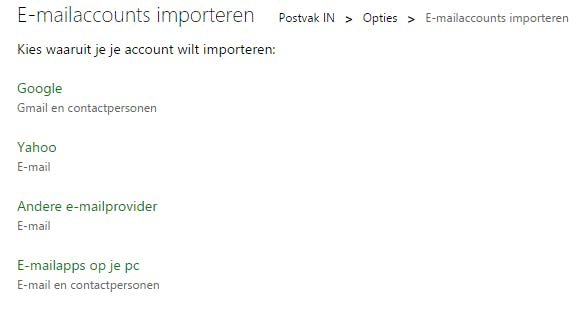 Outlook.com heeft dezelfde functie ingebouwd als Gmail en kan eveneens automatisch e-mail downloaden en importeren in je mailaccount. Hiervoor gaan we naar de site van Outlook.com en klikken we op het tandwieltje rechtsboven. Kies voor Opties en vervolgens voor E-mailaccounts importeren. Je hebt de keuze uit Gmail, Yahoo en andere e-mailproviders en –programma’s op je pc, hoewel je voor die laatste wel Internet Explorer nodig hebt. Volg de stappen om het proces uit te voeren.