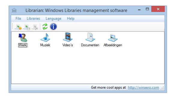 Tot zover de standaardfuncties van Windows. Het is mogelijk om nog wat andere, leuke dingen te doen met de Windows-bibliotheken. Met behulp van de tool Librarian is het mogelijk om eigen pictogrammen aan een bibliotheek toe te kennen, zodat ze eenvoudiger te onderscheiden zijn. Ook is er de optie om netwerk- en verwijderbare schijven toe te voegen als bibliotheek. Librarian is hier te downloaden. Pak na het downloaden het .zip-bestand uit en kies je besturingssysteem in de twee mappen. Dubbelklik op Librarian.exe om de tool te starten. Vervolgens kun je met het eerste pictogram op de werkbalk een nieuwe bibliotheek aanmaken.