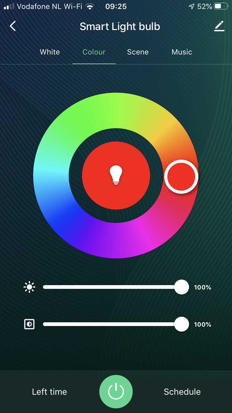 De app is in principe Nederlandstalig, al is niet alles goed vertaald. Je gebruikt de opties White, Colour en Scene om de verlichting te reguleren. Je voegt desgewenst eigen scènes toe en koppelt hier een tijdschema aan. Via virtuele schuifregelaars pas je de kleurtemperatuur en het dimniveau aan. Een leuke optie is Music, waarbij de kleuren telkens wisselen op de beat van de muziek. Hiervoor verlangt de app wel toegang tot de smartphonemicrofoon.
