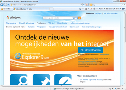 Microsoft heeft een speciale IE9-website in het leven geroepen, waarop de laatste testversie van de nieuwe browser is te vinden. Ga naar Microsoft en klik onder Downloads op Download Beta. Controleer rechtsboven of de website op Nederland staat. Is dat niet het geval, dan past u dit aan via Wijzigen. Controleer vervolgens of onder de blauwe knop Nu downloaden de door u gewenste versie van IE9 staat en of die aansluit bij uw Windows-versie. Als dit inderdaad zo is, klikt u op Nu downloaden. In het andere geval klikt u op Overige versies en kiest u alsnog de door u gewenste variant. Wacht tot de download begint, klik dan op Uitvoeren en vervolg de installatie. Zodra de procedure is afgerond, moet u de computer opnieuw opstarten.