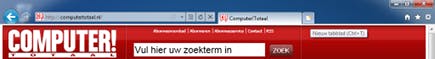 Start de nieuwe browser via Start, Alle programma's, Internet Explorer. Wat meteen opvalt, is de erg lege interface van het programma. U ziet geen menu's en er zijn nauwelijks knoppen aanwezig waar u op zou kunnen klikken. Bovenin is nog net een adresbalk te zien waar u het adres in kun typen van een website die u wilt openen. Om de gewenste site vervolgens daadwerkelijk te kunnen zien, is een druk op Enter nog steeds het handigst. Naast de adresbalk zitten nog een knop voor Vooruit en Terug en helemaal rechts vindt u drie kleinere knoppen voor Startpagina, Favorieten en Extra. Net als zijn voorganger heeft IE9 tabbladen en kunnen binnen de browser meerdere websites tegelijk worden geopend, ieder in hun eigen tab. Door helemaal rechts op het kleine tabje te klikken, opent u een nieuw tabblad.