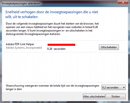 Behalve een download manager heeft IE9 ook een zogenaamde add-on manager aan boord. Het gaat daarbij om een strenge manager die controleert welke invloed alle invoegtoepassingen voor IE hebben op de prestaties. De add-on manager controleert zelf de impact van de add-ons en komt bij het opstarten van IE9 met een venster met opties, als hij daar reden toe ziet. U kunt in dat geval bepaalde invoegtoepassingen selecteren en desgewenst uitschakelen. Ook kunt u hier kiezen wat de maximale impact van alle invoegtoepassingen op het opstarten van de browser mag zijn voordat de add-on manager ingrijpt.
