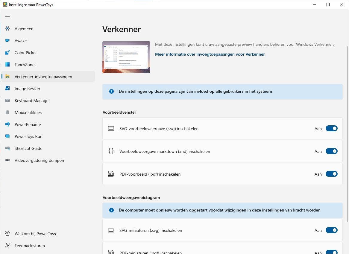 Bij Verkenner-invoegtoepassingen vind je opties om deze functie voor meer bestandstypen in te schakelen. Namelijk .svg-bestanden, .pdf-bestanden en bestanden op basis van markdown. Overigens, een andere manier om de voorbeeldweergave op te roepen is via Beeld te tikken op een van de icoontjes náást Navigatievenster: Voorbeeldvenster of Detailvenster.