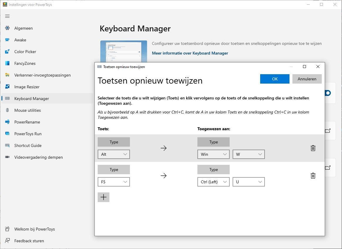 In PowerToys kun je hiermee aan de slag door bij Keyboard Manager te kiezen voor Een toets opnieuw toewijzen of Een snelkoppeling opnieuw toewijzen. Veel toetsenborden bieden deze optie zelf al aan met hun eigen software. Denk aan Logitech-toetsenborden die hiervoor het G Hub-programma gebruiken. Door deze PowerToys-tool is geen aparte software nodig, of een keyboard van een bepaald merk.