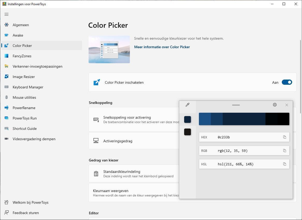 Stel, je ziet een foto van een bos en wilt exact een bepaalde kleur groen daaruit weten. Wijs het deel van de foto aan met de Color Picker en klik met de linkermuisknop. Zowel HEX als RGB- als HSL-kleurcodes worden getoond. Onder Editor vind je er nog veel meer, waaronder ook CMYK.