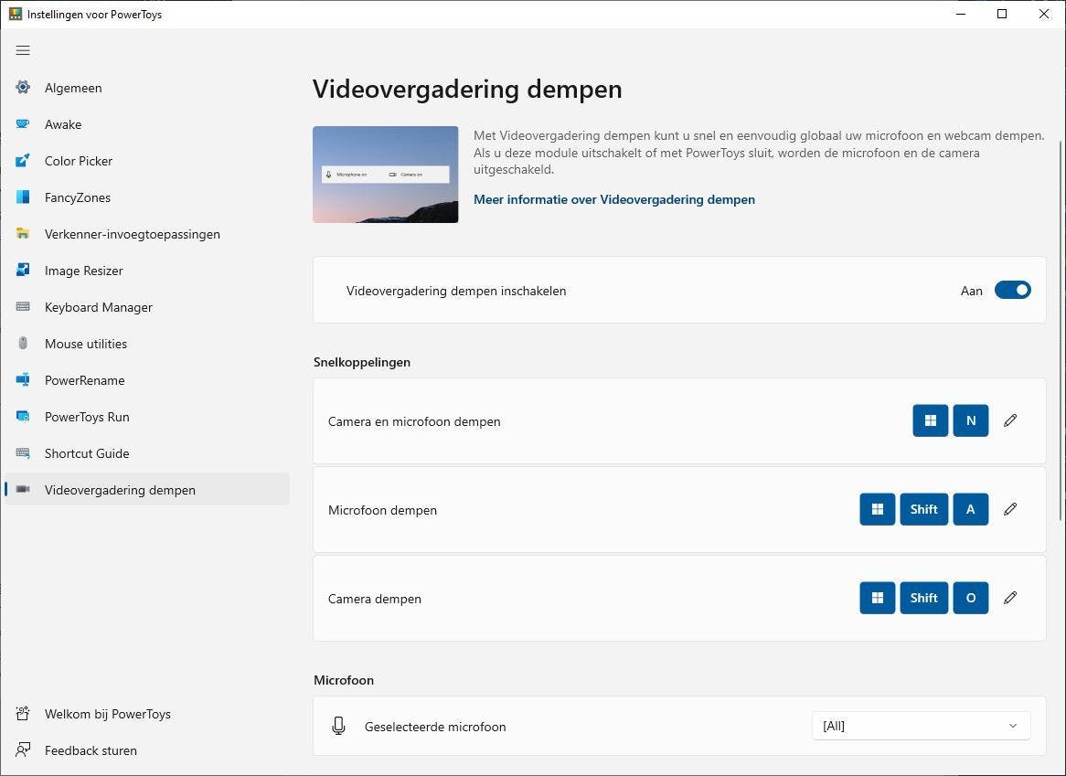 De naam van deze PowerToy zegt eigenlijk genoeg. Kies je voor de optie Videovergadering dempen inschakelen, dan kun je met een toetsencombinatie snel je webcam en/of microfoon uitschakelen tijdens het videobellen. Vanzelfsprekend, nietwaar?