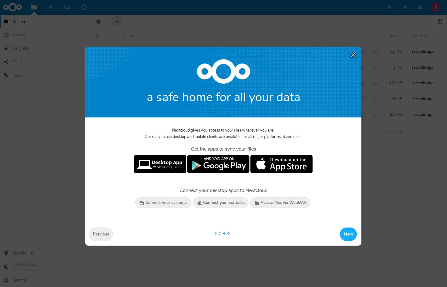 Als alles goed is, zie je nu een aanmeldvenster waar je gevraagd wordt om een beheerdersaccount aan te maken. Kies een gebruikersnaam en wachtwoord en klik op Installatie afronden. Je krijgt nu een welkomstintroductie van de mogelijkheden te zien, en daarna kom je in het hoofdvenster met enkele standaard al geïnstalleerde bestanden. Kijk hier even rond en probeer of alles werkt. Bestanden uploaden doe je op het plusteken te klikken en voor de rest navigeer je eenvoudig door alle mappen. De instellingen vind je onder het icoontje helemaal bovenaan rechts. Doorloop die ook zeker eens en voeg bijvoorbeeld je e-mailadres toe aan je profiel, wat nuttig is voor wachtwoordherstel en notificaties, en vul een e-mailserver in om je notificaties te sturen.