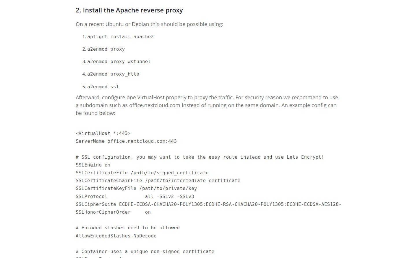 Volg daarna de instructies vanaf 2. Install the Apache reverse proxy en zet de code voor de VirtualHost in het bestand /etc/apache2/sites-available/001-domeinvanjecollabora-le-ssl.conf, maar verwijder de regels die naar de nog nietbestaande paden verwijzen. We volgen de goede raad van de instructies om een afzonderlijk subdomein te gebruiken voor je Collabora Online. Schakel daarna de website in: