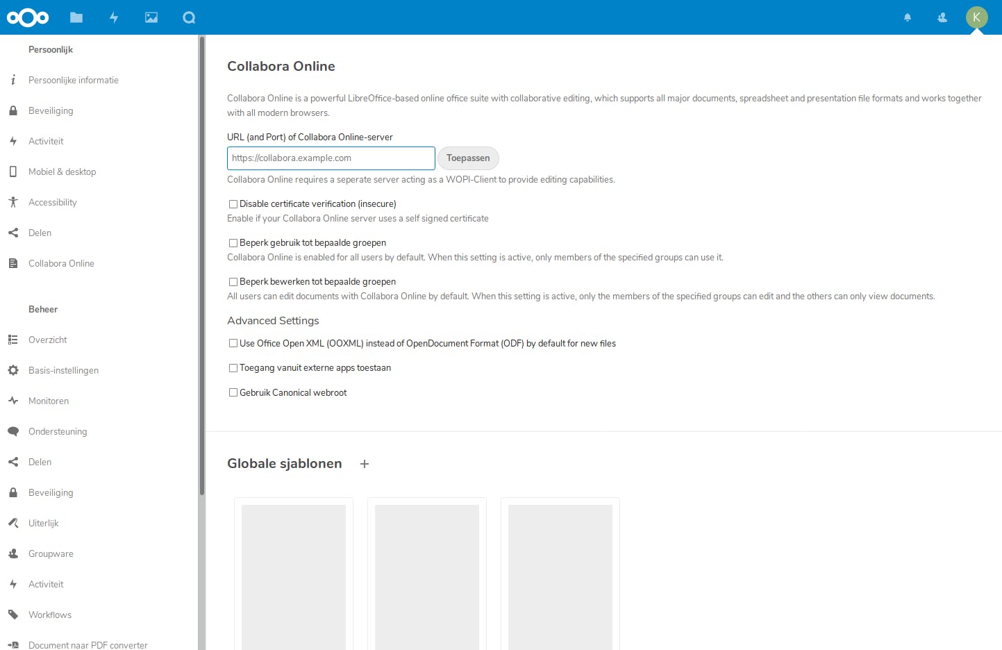 Collabora Online draait nu onder zijn eigen subdomein. Je dient nu in Nextcloud de bijbehorende app te installeren en te configureren om Nextcloud aan Collabora Online te koppelen.