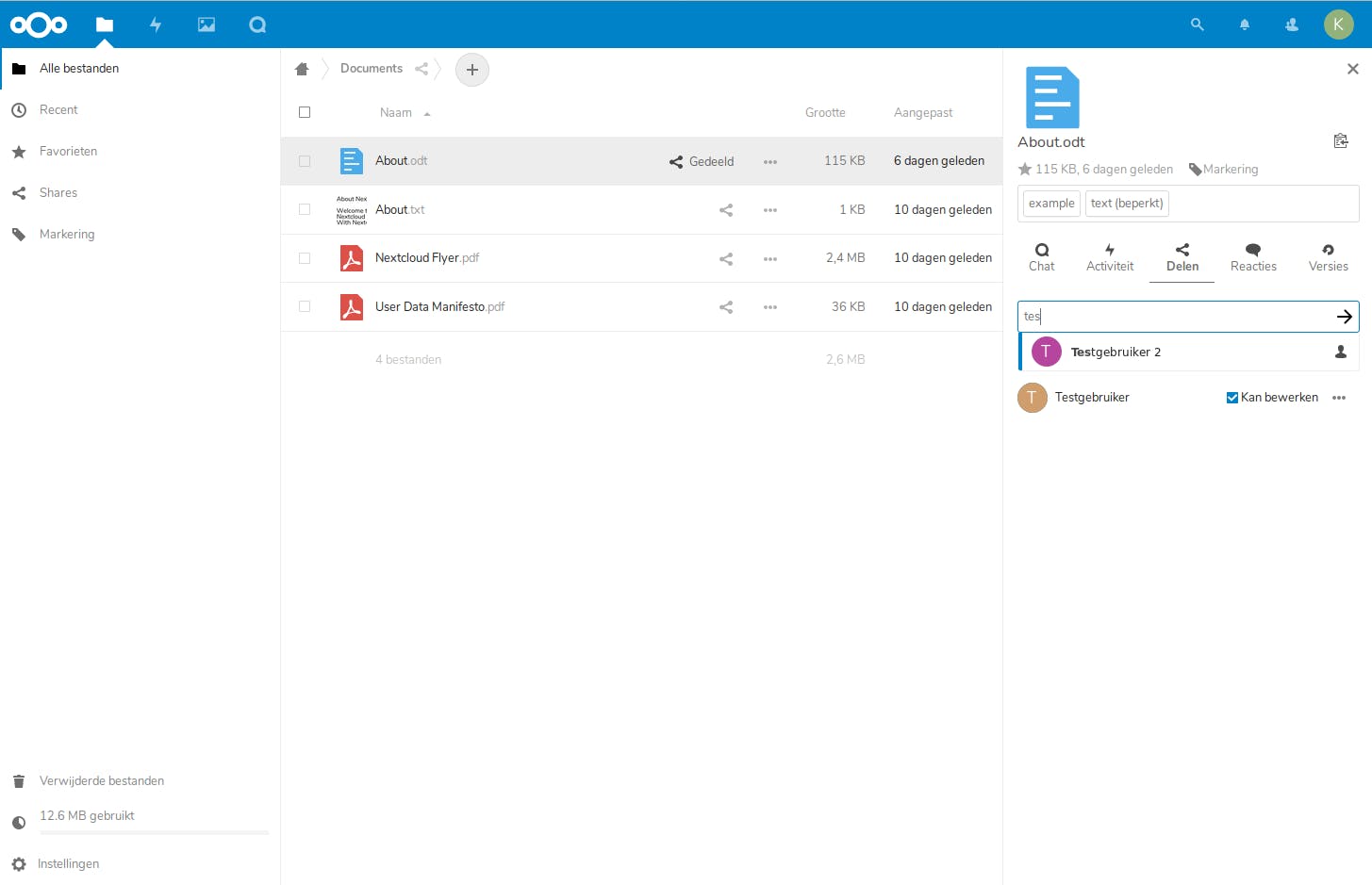 Als je nu met een andere gebruiker op je server wilt samenwerken aan een document, deel je eerst dat document met hem of haar. Ga daarvoor in de web-interface van Nextcloud naar de map waarin je document staat en klik op het delen-icoontje rechts van je document. Vul in het tekstveld daar de gebruiker in, na enkele letters vult Nextcloud de gebruikersnaam al aan. Klik erop om het document met de gebruiker te delen. Standaard krijgt de andere gebruiker de mogelijkheid om het bestand te bewerken.