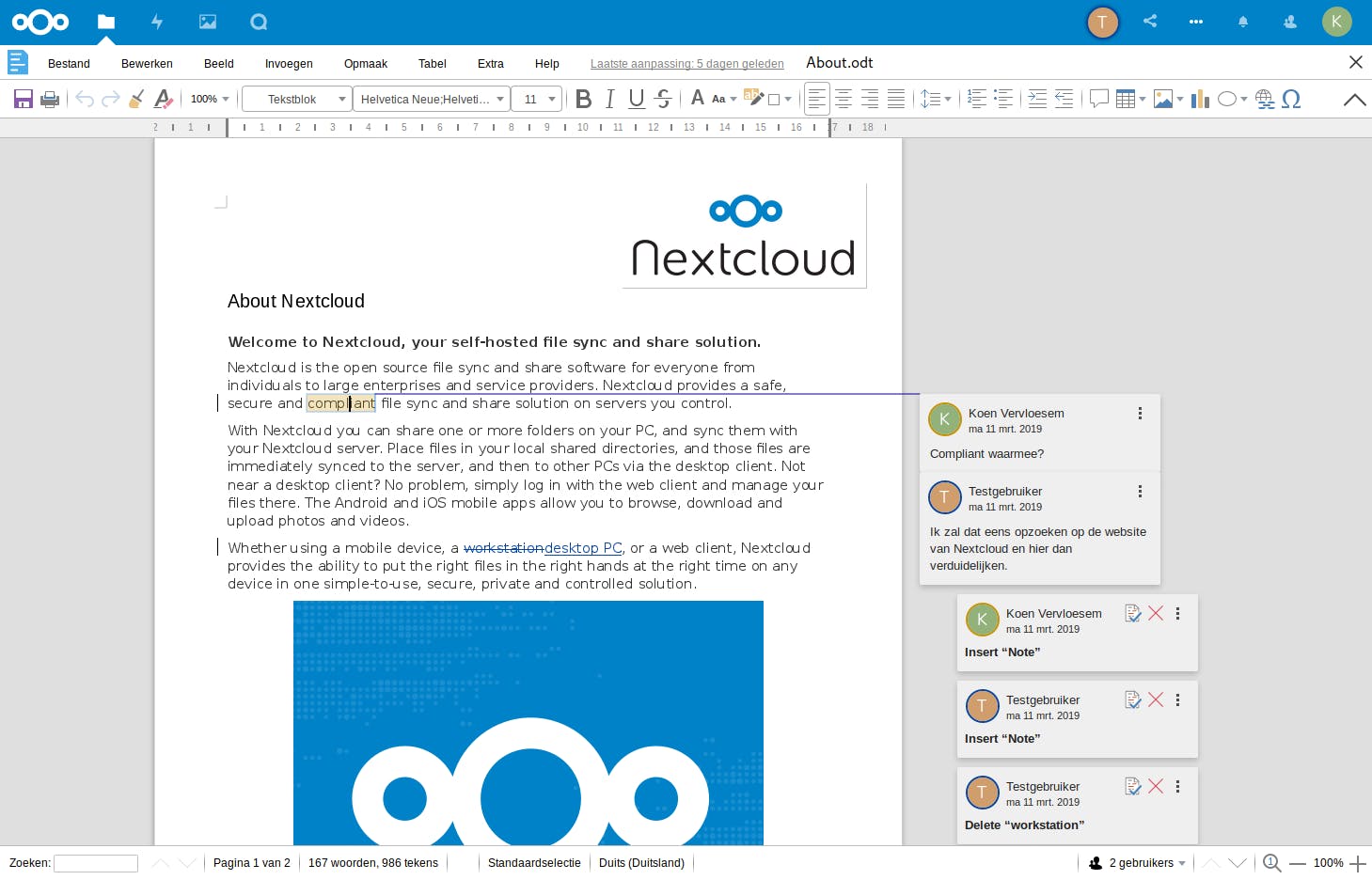Als je nu naar je bestanden in Nextcloud gaat en op een office-document klikt (bijvoorbeeld het voorbeelddocument About.odt in de map Documents), dan krijg je het document in een LibreOffice-achtige tekstverwerker in je webbrowser te zien. De gelijkenis met LibreOffice is niet toevallig: Collabora Online is feitelijk een webversie van LibreOffice.