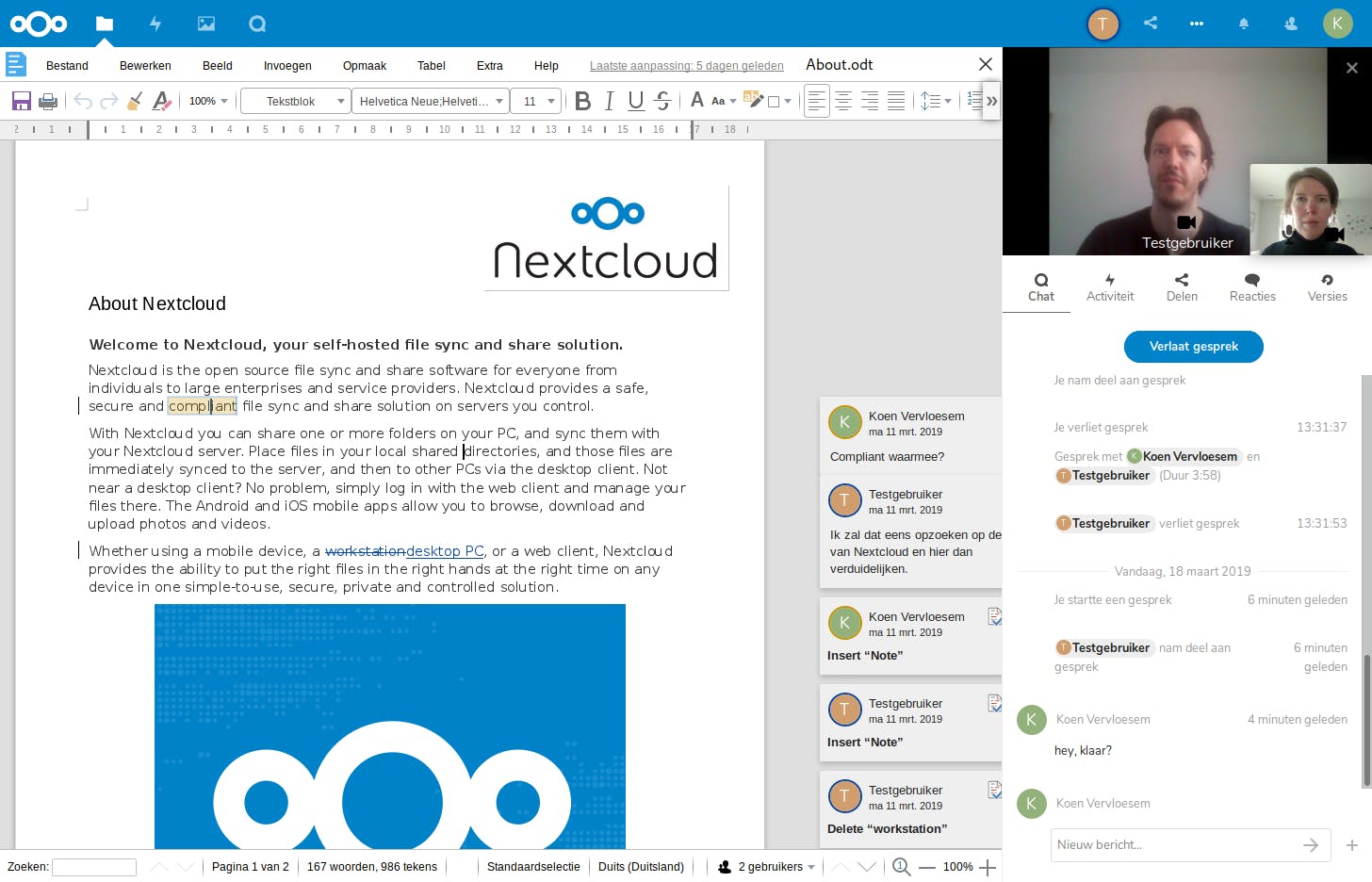De eerste versies van ownCloud, de voorloper van Nextcloud, focusten vooral op de implementatie van online opslag en bestandssynchronisatie op je eigen server. Het was dus opgezet als een opensource alternatief voor Dropbox. Maar in de recentste versies, zeker sinds Nextcloud zich afsplitste van ownCloud, is de nadruk meer en meer komen te liggen op samenwerken aan documenten. Door de integratie met Collabora Online kun je documenten op je Nextcloud-server met meerdere personen tegelijk bekijken én bewerken, en daarnaast met de anderen chatten en videobellen. En ook een privé sociaal netwerk behoort tot de mogelijkheden. Kortom, je hebt een eigen Google Docs of Office 365 op je server draaien, zonder dat je je gegevens aan een andere partij hoeft prijs te geven.