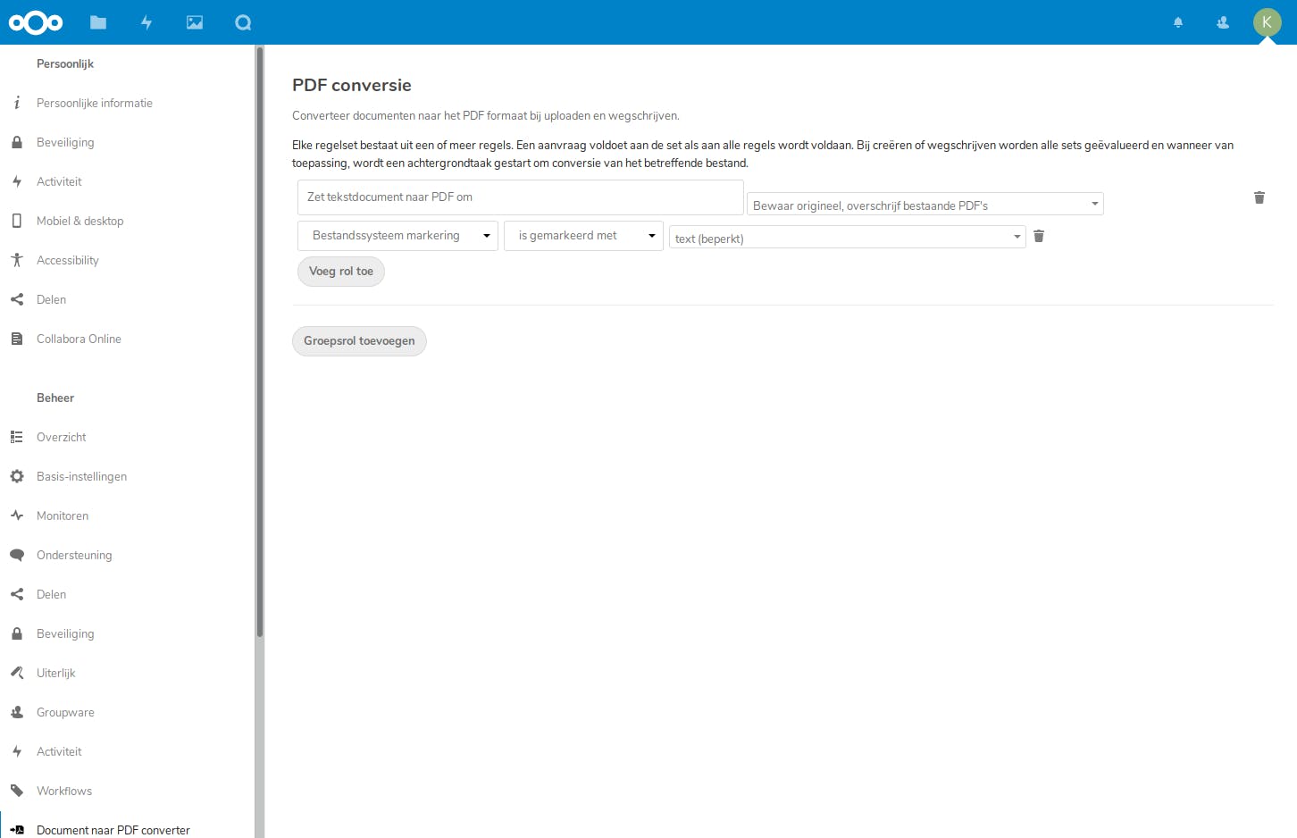 Elke keer dat je nu een document met de tag text uploadt of opslaat, maakt Nextcloud er automatisch een pdf-versie van aan. Overigens kun je met de app Workflow external scripts je eigen scripts opstarten bij elke upload of wijziging van bestanden. Dat maakt de mogelijkheden onbegrensd!