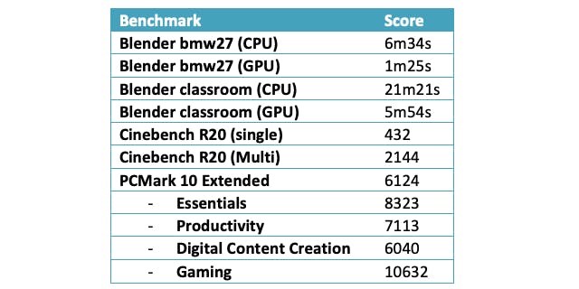 Om een workstation desktop te kunnen vervangen, moet naast het beeldscherm ook de hardware op orde zijn. De specificaties beloven een hoop goeds en die verwachting wordt in onze benchmarks ook bevestigd. Hoewel de resultaten van de processor tegenwoordig niet verbluffend meer zijn, doet de Nvidia Quaddro RTX 3000 precies wat hij moet doen. Met name in de Blender render-benchmark zijn de scores uitstekend en zien we resultaten die vergelijkbaar zijn met de desktop-variant van de GPU.
