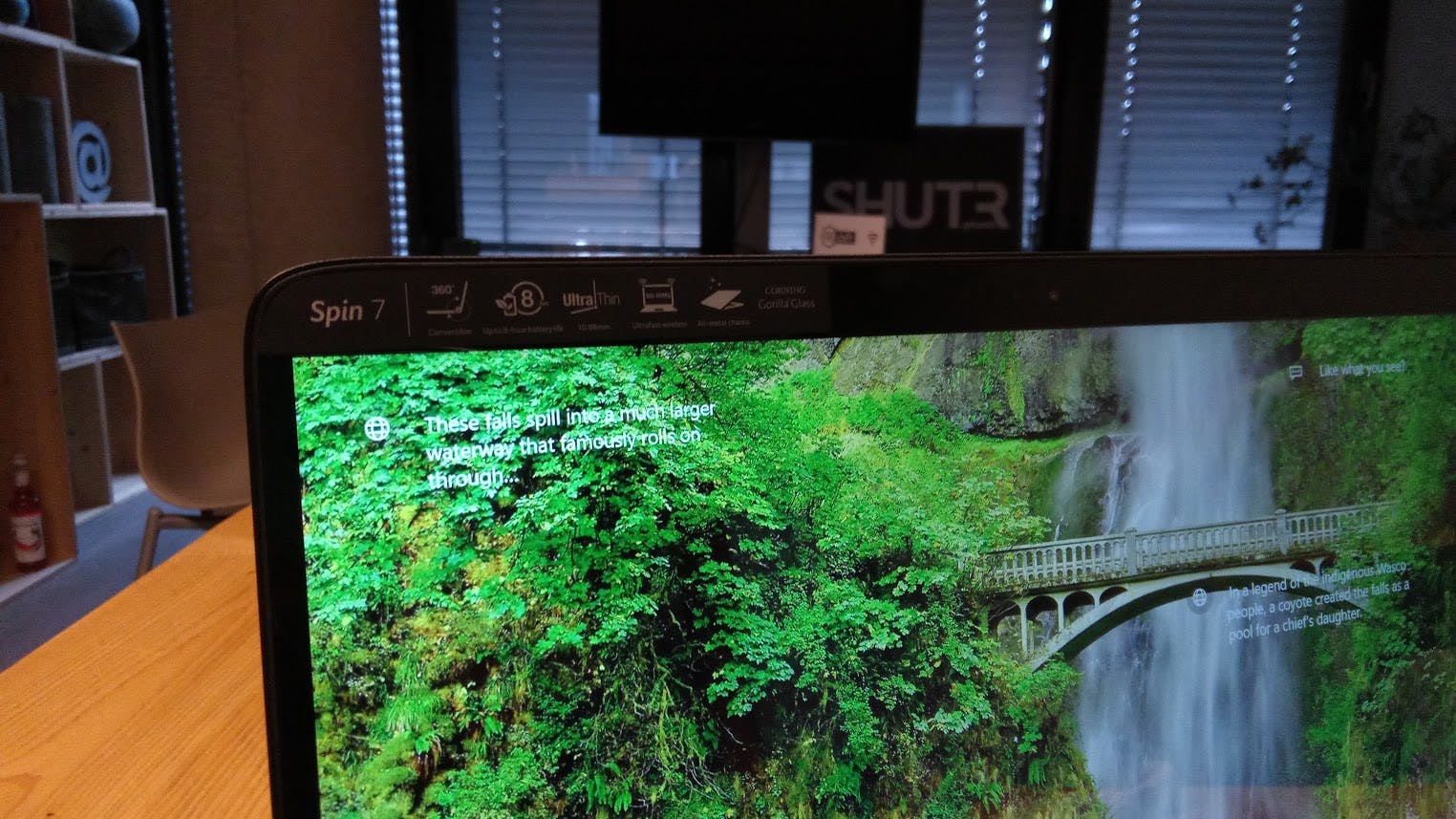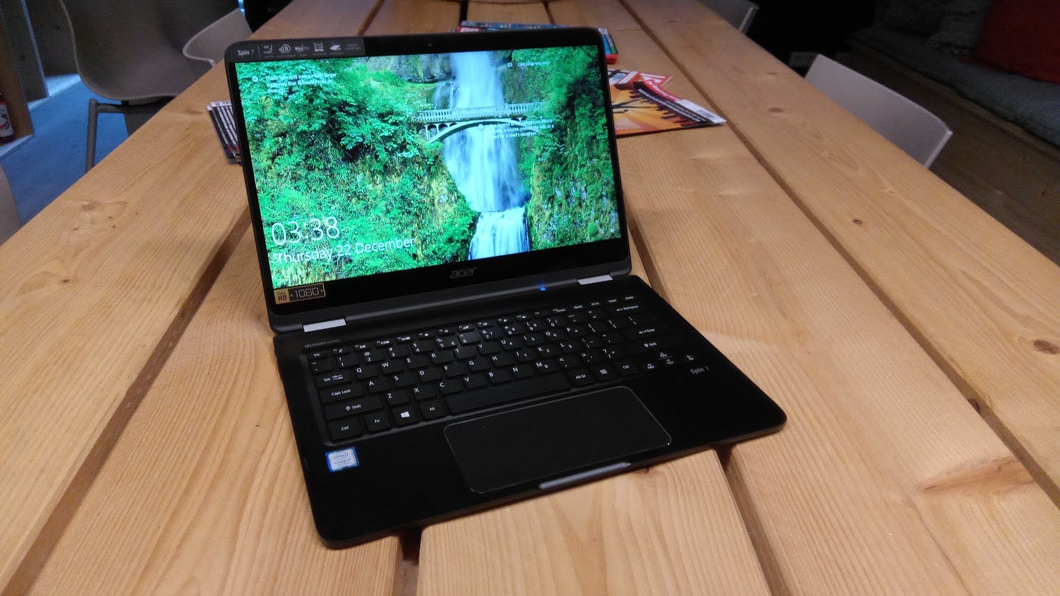 De Spin heeft een aanraakscherm en dankzij een zogenoemd 360graden-scharnier kun je het scherm helemaal naar achteren klappen. Het aanraakscherm werkt soepel en ondersteunt tien gelijktijdige aanraakpunten. Na het omklappen van het scherm worden het toetsenbord en de touchpad uitgeschakeld. Windows kan eventueel ook automatisch overschakelen naar de tabletmodus waarin het startscherm met tegels getoond wordt. Je kunt deze automatische omschakeling ook uitschakelen. Je hebt na het omklappen een forse 14inch-tablet die lekker soepel werkt. Dankzij geïntegreerde magneten ‘plakt’ de achterkant van het scherm aan de onderkant van de notebook. Handig bedacht, maar toen we de Spin 7 op een metalen oppervlak gebruikten, bleken die magneetjes wel heel sterk en plakte de onderkant van de Spin 7 aan tafel.