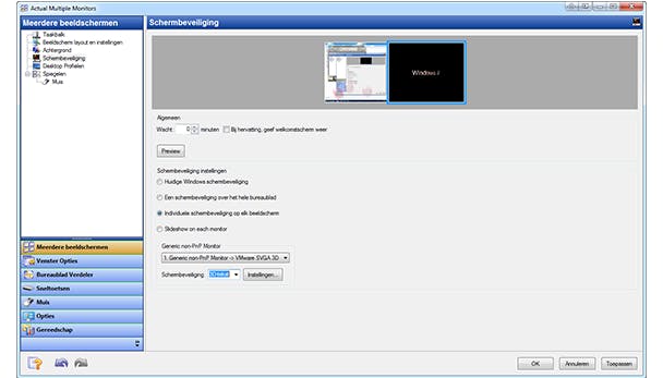 Hoewel de interface van Actual Multiple Monitors netjes is gecategoriseerd, zijn er erg veel opties om wegwijs in te worden. Aan de linkerkant van het venster vinden we de menu's met verschillende categorieën zoals Meerdere beeldschermen, Venster Opties, Bureaublad Verdeler, Sneltoetsen. Klik je op één van de categorieën, dan kies je in het vak erboven uit verschillende subcategorieën. Zo krijg je bij de categorie Meerdere beeldschermen opties om de taakbalk, de achtergrond en de schermbeveiliging aan te passen.