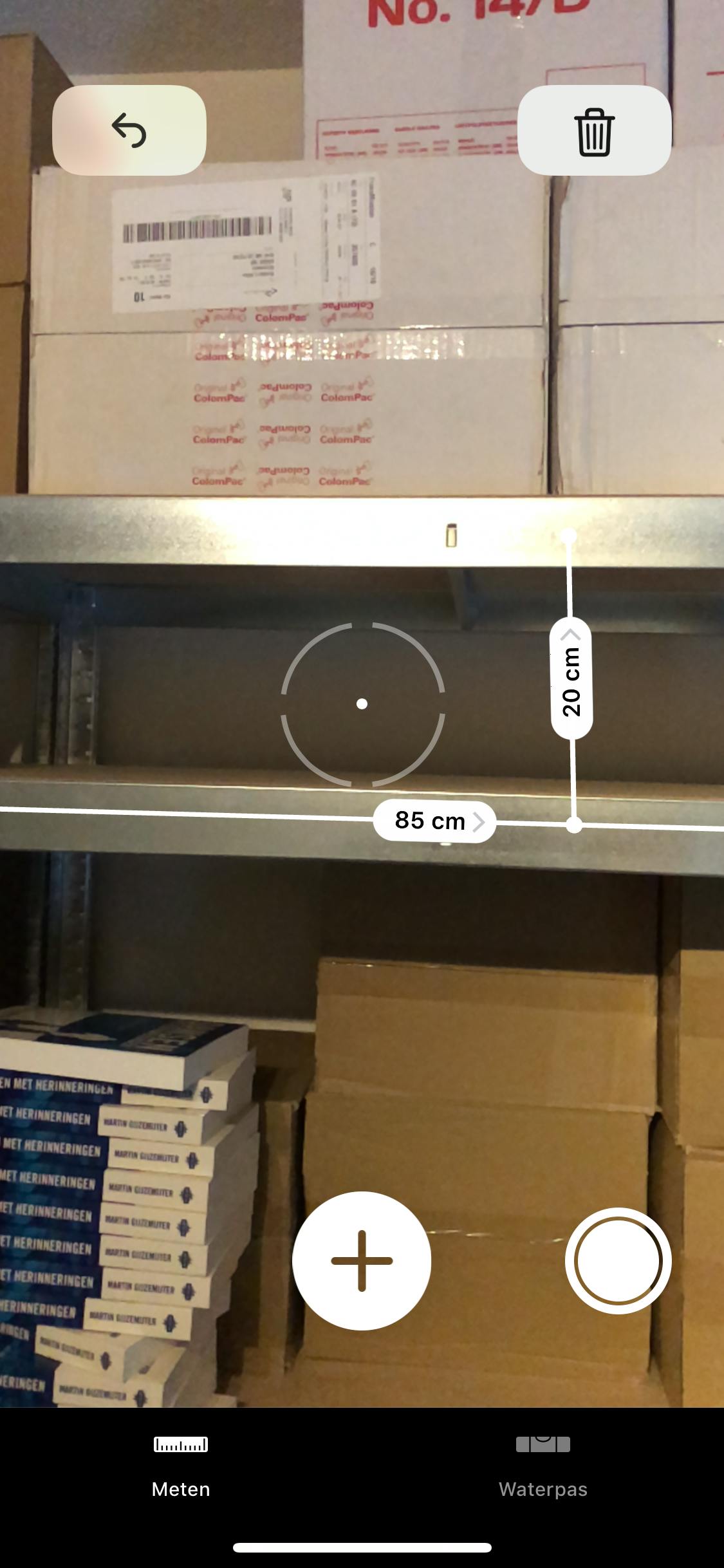 Wanneer je de app start in iOS 12, krijg je eerst de vraag om je smartphone door de ruimte te bewegen. De reden daarvoor is dat de app inzicht moet krijgen in de ruimte, en de oppervlakken daarin. Immers, zonder referentiekaders kan een app als deze onmogelijk nauwkeurig meten. De app geeft aan wanneer je de iPhone voldoende hebt bewogen om de ruimte in kaart te brengen. Vervolgens richt je het witte puntje in het midden van je display op het startpunt dat je wilt meten, en druk je op het grote plusteken. Wanneer je nu je iPhone beweegt, zie je dat er direct een gele lijn wordt getrokken vanuit je startpunt. Beweeg je toestel nu naar het eindpunt en druk wederom op het plusteken. Er wordt nu een witte lijn getekend, met daarin de afmeting. Het leuke is dat je niet beperkt bent tot één lijn, je kunt door de ruimte heen lopen en overal lijnen trekken om zo de afmetingen van de ruimte digitaal in kaart te brengen. Ook prettig is dat je heel eenvoudig een lijn haaks op een andere kunt trekken (je voelt dankzij haptische feedback wanneer je op de lijn zit) zodat je hoogte en breedte in kaart kunt brengen.