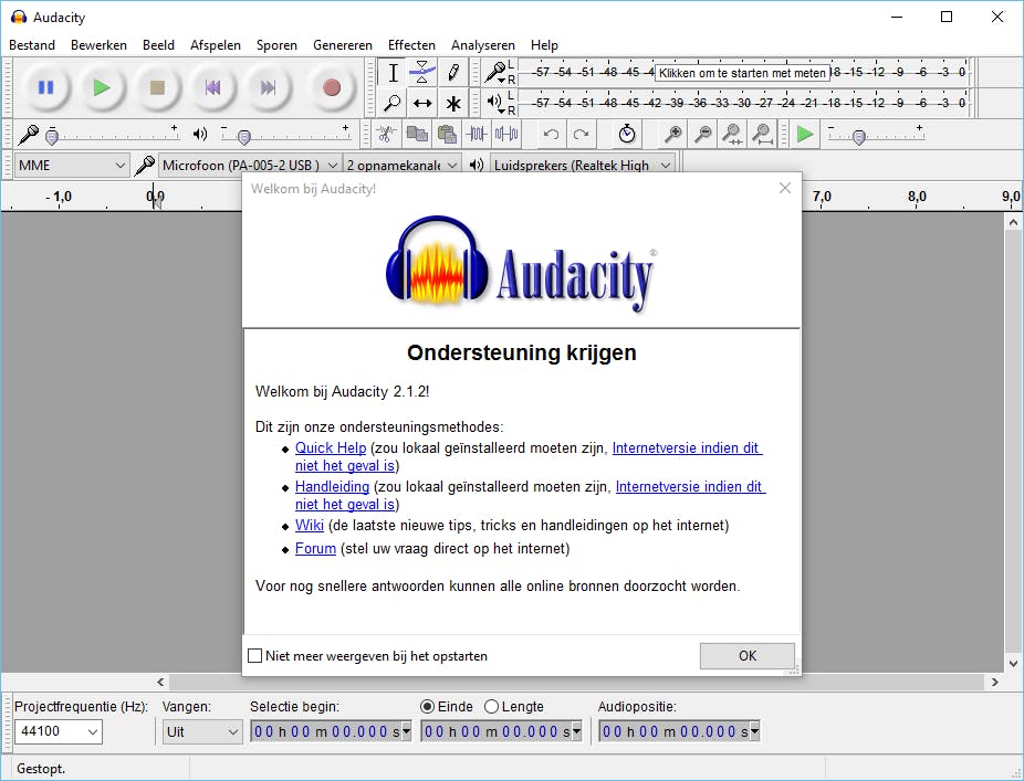 Audacity is een gratis audiobewerkingsprogramma. Hiermee neem je eenvoudig muziek van analoge geluidsbronnen op. Surf hiernaartoe en download het installatiebestand naar je computer. Er zijn versies voor Windows, OS X en Linux beschikbaar. In dit artikel gaan we aan de slag met de Windows-editie. De makers raden minimaal een processor met een kloksnelheid van 1 GHz en 2 GB RAM aan, al is het gebruik van snellere hardware geen overbodige luxe. Overigens kun je het installatiebestand met of zonder Engelstalige help-instructies downloaden. Voor de volledigheid kies je voor de complete installer-versie. Voer het exe-bestand uit en kies voor de Nederlandse taal. Je klikt viermaal op Volgende, waarna je bevestigt met Installeren. Via Volgende en Voltooien start je het programma voor de eerste keer op.