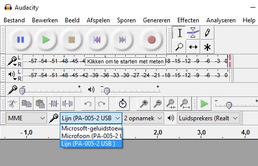 Belangrijk is dat Audacity het geluid, afkomstig van je (usb-)platenspeler, cassettedeck, bandrecorder of (voor)versterker, herkent als opnameapparaat. Bovenaan in de gebruikersomgeving doe je hiervoor een beroep op de zogeheten apparaat-werkbalk. Kies achter het microfoontje in het uitrolmenu de juiste ingang van je pc, zoals de analoge lijningang of usb-poort. Uiteraard wil je de muziek in stereogeluid vastleggen, dus laat je de instelling 2 opnamekanalen ongewijzigd. Selecteer in het laatste veld de luidsprekers die op je pc zijn aangesloten, zodat je gedigitaliseerde muziek op een later moment kunt terugluisteren.