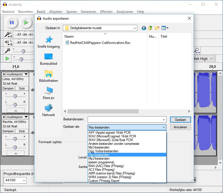 Zodra de opname is afgerond, giet je het geluidsfragment in een audiobestand. Klik hiervoor op Bestand / Audio exporteren en selecteer op je harde schijf een opslagmap. Je bedenkt een bestandsnaam, waarna je het gewenste audioformaat selecteert. De keuze hierin is behoorlijk groot. Welk audioformaat je het beste kunt kiezen, is van verschillende factoren afhankelijk. Ga je voor een hoge geluidskwaliteit zonder audioverlies, dan liggen de formaten wav, aiff en flac voor de hand. Een nadeel hiervan is dat dergelijke audiobestanden behoorlijk wat opslagcapaciteit opeisen. In plaats daarvan kun je gedigitaliseerde muziek ook in een gecomprimeerd audiobestand bewaren, zoals ogg, wma of mp3.