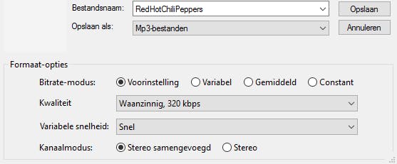 Audacity beschikt van zichzelf niet over het juiste gereedschap om gedigitaliseerde muziek om te zetten naar een gecomprimeerd mp3-bestand. Door de zogeheten Lame-encoder aan het audiobewerkingsprogramma toe te voegen, is dat wel mogelijk. Surf hiervoor hiernaartoe en klik de bovenste downloadlink aan om het exe-bestand op te slaan. Op het moment van schrijven is dat Lame v3.99.3 for Windows.exe. Voer de installatie uit door telkens op Next te klikken. Belangrijk is om de installatiemap van Lame niet te wijzigen. Bevestig als laatste met Install / Finish. Je kunt muziek nu als mp3-bestand opslaan. Ga in Audacity naar Bestand / Audio exporteren en selecteer achter Opslaan als de optie Mp3-bestanden. Bij Kwaliteit stel je eventueel de bitrate in met een maximum van 320 Kbit/s. Klik ten slotte op Opslaan en OK.