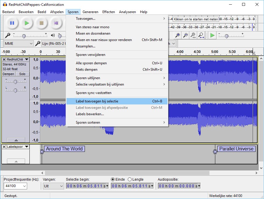 Gebruik hiervoor de mediaknoppen boven aan het venster. Zodra je het exacte beginpunt weet, klik je binnen de geluidsgrafiek om de verticale marker op de goede plek te zetten. Klik daarna op Sporen / Label toevoegen bij selectie. Merk op dat er onder de geluidsgrafiek een leeg label in beeld verschijnt. Klik op het witte label en typ de naam van het liedje. Plaats de verticale marker vervolgens in de geluidsgrafiek op de plek waar het tweede liedje begint. Kies vervolgens wederom voor Sporen / Label toevoegen bij selectie. Herhaal deze stappen voor ieder liedje. Na afloop ga je naar Bestand / Meervoudig exporteren. Selecteer met Kiezen de opslagmap en stel bij Format het gewenste audioformaat in. De overige instellingen laat je ongewijzigd, waarna je uiteindelijk kiest voor Exporteren / OK.