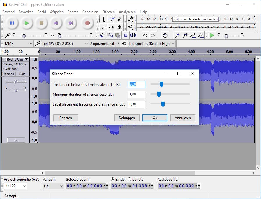 Heb je geen zin om telkens handmatig het beginpunt van een liedje op te zoeken om een audiobestand te splitsen? Audacity herkent op eigen houtje stiltes van een lp of cassettebandje en wijst op basis daarvan automatisch labels toe. Deze functie werkt weliswaar lang niet voor iedere geluidsdrager even goed, maar je kunt het natuurlijk altijd even proberen. Klik in het programmavenster op Analyseren / Silence Finder. In het volgende venster bepaal je aan welke criteria de stilte moet voldoen om een label te krijgen. Je geeft bijvoorbeeld aan dat de stilte langer dan een seconde moet duren. Voeg aan de labels onder de geluidsgrafiek de namen van de liedjes toe.
