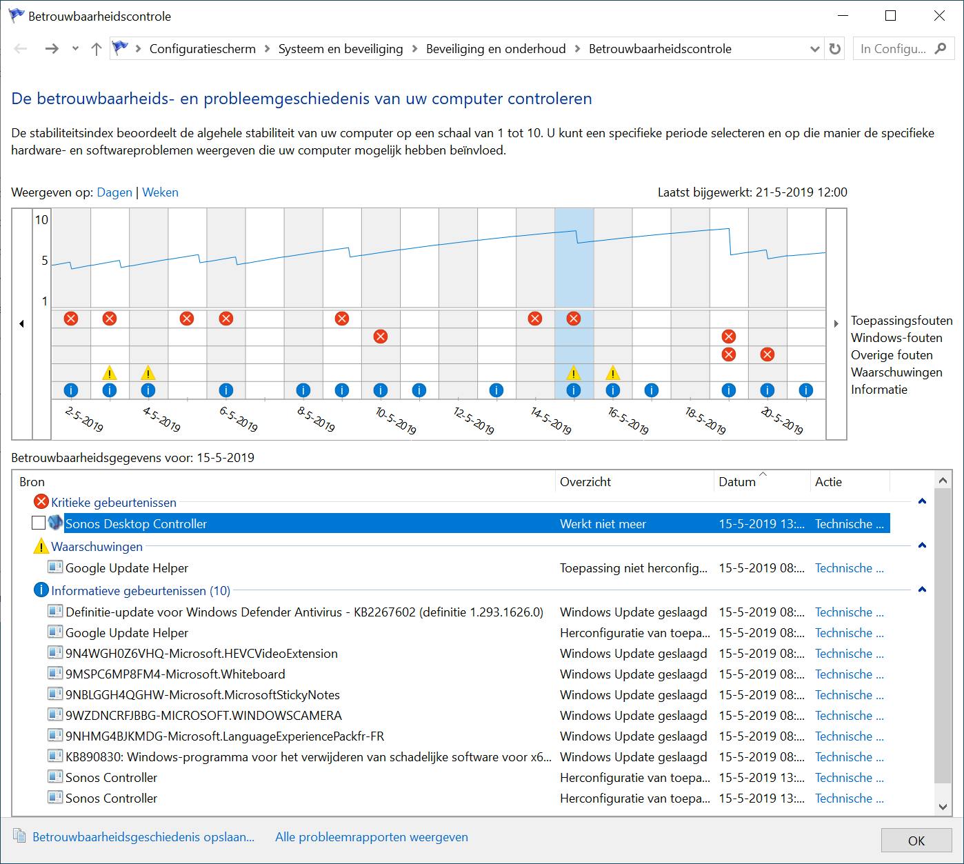 Twijfel je aan de stabiliteit van de computer, bijvoorbeeld omdat de computer regelmatig vastloopt of onverwacht opnieuw opstart? Met de Betrouwbaarheidsgeschiedenis zie je hoe de computer presteert. Er wordt daarbij een schaal van 1 tot 10 gehanteerd. In het Startmenu typ je Betrouwbaarheidsgeschiedenis. Klik hierna op Betrouwbaarheidsgeschiedenis weergeven. In een grafiek zie je de stabiliteitsindex. Daalt de lijn, dan is de computer minder stabiel dan het punt ervoor. Klik op een datum om de details te tonen. Er wordt onderscheid gemaakt tussen verschillende ‘mijlpalen’: zo zijn er kritieke gebeurtenissen (gebeurtenissen waardoor de computer of een programma bijvoorbeeld vastloopt), waarschuwingen (incidenten die mogelijk tot een probleem kunnen leiden) en informatieve gebeurtenissen (zoals geslaagde updates). Voor meer informatie over een gebeurtenis dubbelklik je erop. De Betrouwbaarheidsgeschiedenis komt goed van pas als je weet wanneer de computer kuren vertoonde: zoek de datum op in het overzicht en achterhaal de mogelijke oorzaak.