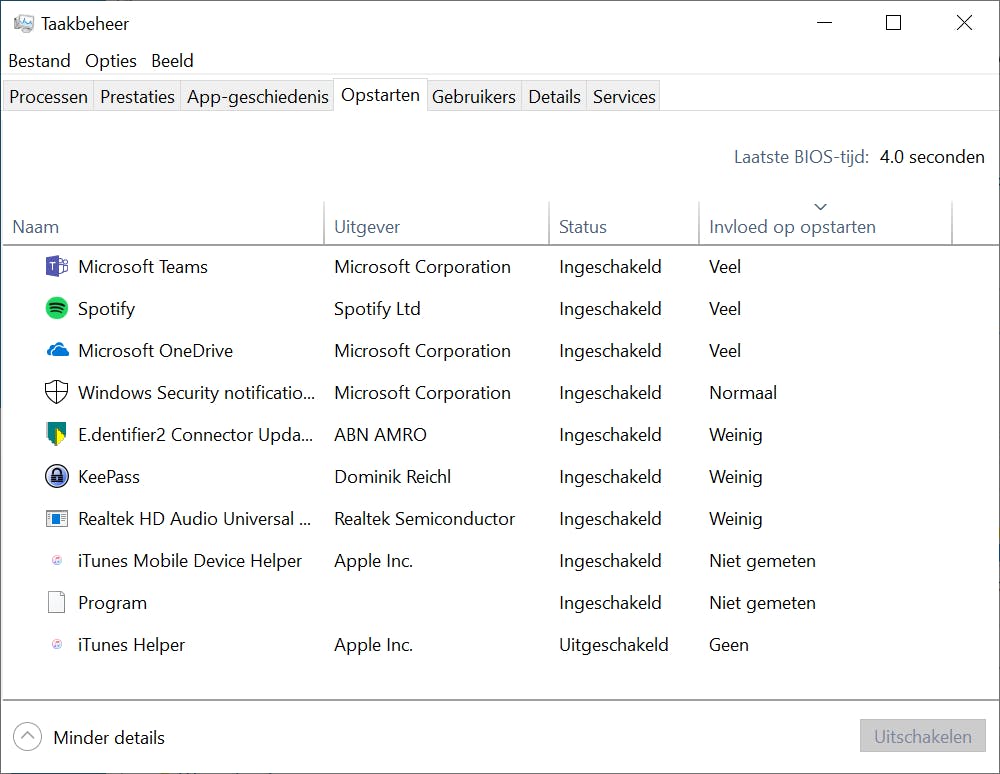 Reageert een programma niet meer, en krijg je het met geen mogelijkheid afgesloten? Maak gebruik van Taakbeheer. Hiermee kun je programma’s en processen afsluiten. Hierna kun je het probleemprogramma opnieuw starten of – als je hieraan geen behoefte hebt – in elk geval weer beschikken over de systeembronnen die eerst door het programma in beslag werden genomen. Bovendien geeft Taakbeheer een goed overzicht van de geopende programma’s en toont het welke (achtergrond)processen momenteel actief zijn. Je opent Taakbeheer met de toetsencombinatie Ctrl+Shift+Esc (of via de tussenstap Ctrl+Alt+Del). De tab Processen laat je zien welke programma’s en processen actief zijn, en in welke mate zijn aanspraak maken op onderdelen zoals de processor en het geheugen. Klik op een kolom om de programma’s en processen te sorteren op een specifieke volgorde, bijvoorbeeld op de mate van geheugengebruik. Om een probleemprogramma geforceerd te sluiten, klik je erop met de rechtermuisknop. Kies Beëindigen. Een ander interessant onderdeel van Taakbeheer is de tab Opstarten. In de kolom Invloed op opstarten zie je in één oogopslag hoeveel beslag een programma legt op de opstartfase van Windows. Bepaal op basis hiervan per programma of het dat waard is.