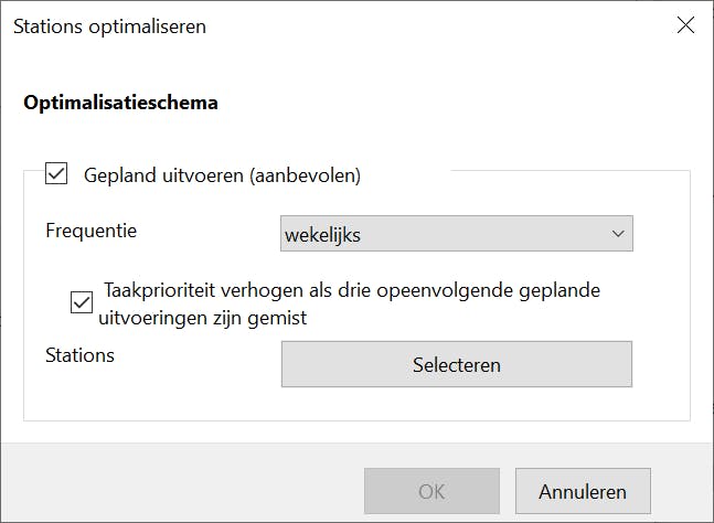 We blijven nog even bij de gezondheid van de schijven. Windows houdt niet alleen de gezondheid in de gaten, maar voert ook een optimalisatie uit voor schijven die zijn ingebouwd in de computer of zijn aangesloten. Dat gebeurt normaal gesproken wekelijks. Ook nieuw toegevoegde schijven worden geoptimaliseerd. Je kunt de instellingen van automatische optimalisatie aanpassen en ook handmatig een optimalisatiesessie starten. In het Startmenu typ je Optimaliseren. Kies voor Stations defragmenteren en optimaliseren. Een overzicht met schijven verschijnt. In de kolom Huidige status lees je of de schijven in orde zijn. Selecteer een schijf en klik op Optimaliseren om de optimalisatie handmatig te starten. Via de knop Instellingen wijzigen pas je het optimalisatieschema aan. Zo kun je de standaardfrequentie van een week aanpassen naar bijvoorbeeld maandelijks. Klik op de knop Selecteren om te bepalen welke schijven voor optimalisatie in aanmerking komen. In dit venster geef je ook aan of nieuw toegevoegde schijven wel of niet mogen worden meegenomen (via de optie Nieuwe stations automatisch optimaliseren).
