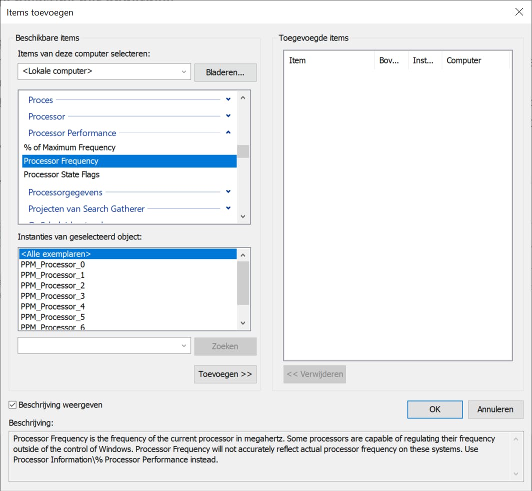 Ben je een iets meer gevorderde gebruiker? Dan mag het onderdeel Prestatiemeter niet ontbreken in de gereedschapskist. Open het Startmenu en typ Prestatiemeter. Via dit onderdeel kun je de prestaties van verschillende onderdelen nauwlettend in het oog houden. Kies in het linkergedeelte van het venster voor Controlehulpprogramma’s, Prestatiemeter. De grafiek is in eerste instantie nog aardig leeg, maar daar brengen we verandering in. Klik met de rechtermuisknop op de grafiek. Kies Items toevoegen. In het onderdeel Beschikbare items zie je op welke vlakken je het systeem kunt bekijken. Bijvoorbeeld op het gebied van de processorprestaties, of op het gebied van de snelheid van het geheugen. Selecteer de onderdelen in de lijst links en voeg ze toe met een klik op Toevoegen. Tevreden over de selectie? Klik op OK. De grafiek wordt nu gevuld met de gegevens die je hebt geselecteerd. Als je meerdere onderdelen in de grafiek toont, kun je de eigenschappen ervan per onderdeel bepalen. Dubbelklik op het onderdeel dat je wilt aanpassen, in de lijst die onder de grafiek wordt getoond. Pas de instellingen aan in het eigenschappenvenster en bevestig met een klik op OK.
