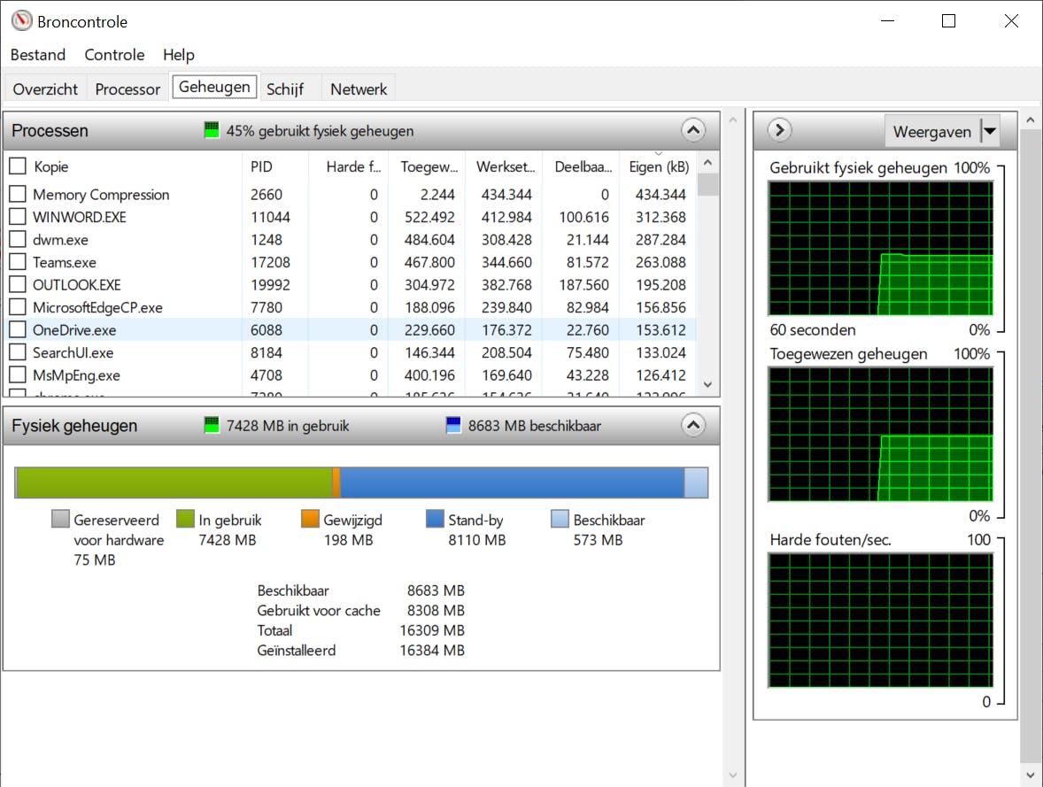 Het onderdeel Broncontrole geeft je een goed beeld van het beslag dat de verschillende Windows-onderdelen leggen op de systeembronnen. Het geeft onder meer weer hoe zwaar de processor wordt belast, hoe de schijven presteren en hoe het gesteld is met het geheugen. Open het Startmenu en typ Broncontrole. Op de tab Overzicht zie je een totaalplaatje van het systeem. Om meer details te zien, klik je op een van de vier tabbladen die ernaast worden getoond: Processor, Geheugen, Schijf en Netwerk. Uiterst rechts in het venster worden grafieken getoond van de prestaties. Wil je extra informatie zien of juist weglaten, dan klik je met de rechtermuisknop op de lijst en kies je voor Kolommen selecteren. Wil je meer weten over een bepaald onderdeel, dan klik je erop met rechts en kies je voor Online zoeken.