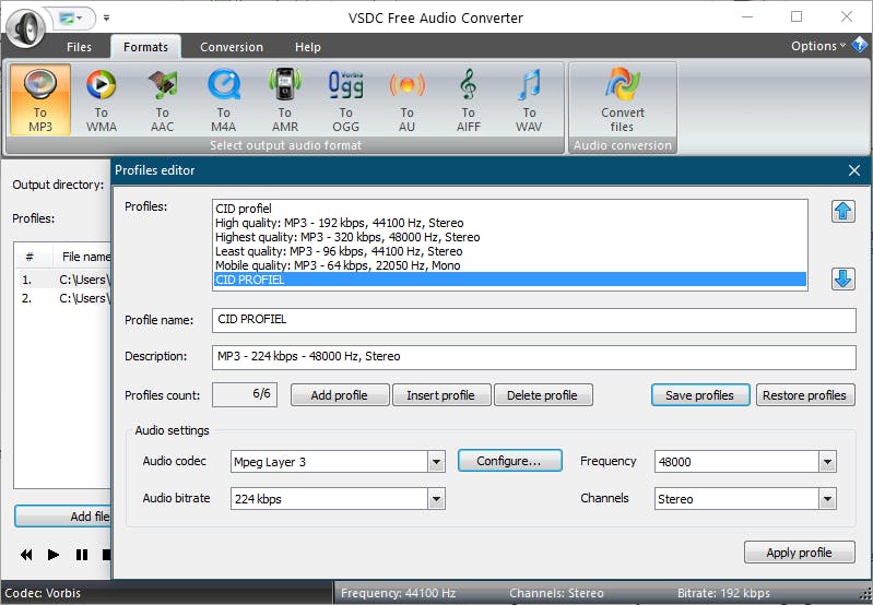 Je hoeft deze echter niet te gebruiken; via de knop Edit profiles kunt je je eigen profielen toevoegen gebaseerd op allerlei opties, zoals Audio bitrate, Frequency en Channels. Heb je eenmaal het gewenste profiel gekozen, dan start je de conversie door op Convert files te klikken.