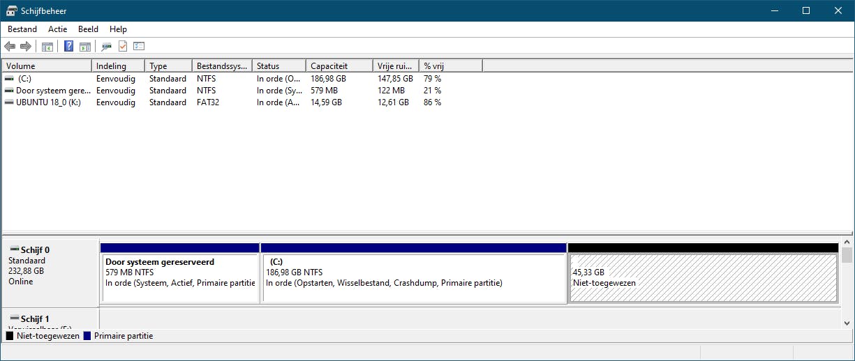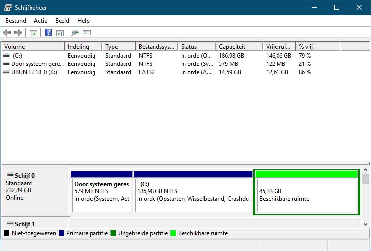 Linux is weg en Windows draait weer als een zonnetje. Toch zijn er nog enkele restanten om aan te pakken. Zo is er de vrijgekomen schijfruimte die op dit moment geen functie heeft. Die kun je gelukkig hergebruiken. De opties behandelen we in het artikel over Windows 10-partities vergroten.