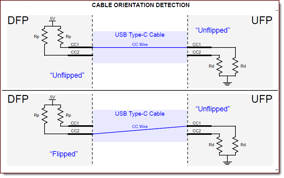 Een pull-upweerstand trekt het voltage terug naar het grondniveau, terwijl een pull-upweerstand het omgekeerde doet en het signaal omhoog trekt naar een standaardwaarde, voor usb-c is dat 5 volt. Als er een dfp-ufp-paar is aangesloten, is er een voltage actief op de cc-lijn en weten beide apparaten hoe ze zijn aangesloten. Elke usb-c-kabel heeft twee van die cc-pinnen. Door de voltages in de gaten te houden op elke cc-pin, weet het apparaat hoe de kabel is georiënteerd en kunnen de juiste lees- en schrijfpinnen gebruikt worden.