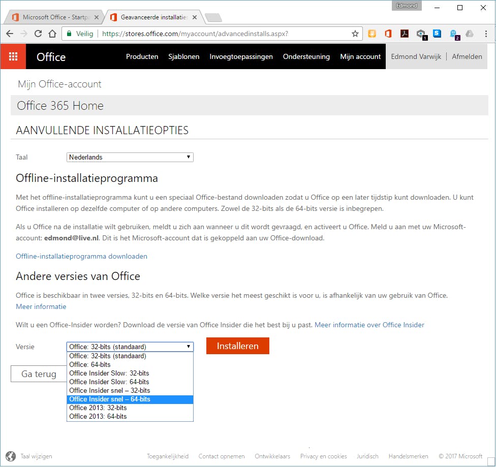 Het succes van het Windows Insider-programma was voor Microsoft reden om ook pre-releaseversies van Office beschikbaar te gaan stellen. Gebruik je Office 365, log dan in op www.office.com en klik op Aanmelden. Log in met het Microsoft-account waarmee je jouw versie van Office hebt gekoppeld. Klik op Office installeren / Taal en installatieopties / Aanvullende installatieopties. Selecteer in het menu onder Andere versies van Office één van de Office Insider-versies. Je kunt kiezen tussen 32 en 64 bit en opnieuw Slow en Snel. Klik op Installeren. Voor meer informatie kun je hier terecht.