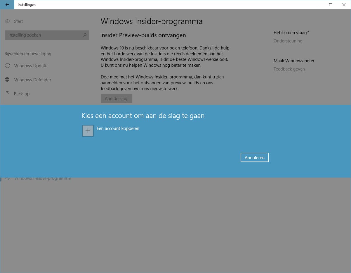 Om te beginnen met het Windows Insider-programma, sluit je eerst alle programma’s. Ga dan naar Start / Instellingen / Bijwerken en beveiliging / Windows Insider-programma. Klik op Aan de slag. Om mee te doen moet je je aanmelden: klik op Een account koppelen. Dit account moet een Microsoft-account zijn, bijvoorbeeld een Hotmail- of Live-mailadres, of een ander mailadres dat aan de Microsoft-service gekoppeld is. Selecteer het account en klik op Doorgaan. Geef aan in welk tempo je de nieuwe builds wilt ontvangen. Er is keuze tussen Release Preview (je krijgt alleen de bijna-officiële versies gestuurd), Slow (je krijgt vaker een nieuwe versie, maar wel één die al beter is getest) en Fast (je krijgt bijna wekelijks de nieuwste publiek beschikbare testversie). Selecteer jouw voorkeur en klik op Bevestigen. Microsoft legt nog even uit wat dit betekent, klik opnieuw op Bevestigen. Om de keuze definitief te maken moet de pc opnieuw opstarten, klik op Nu opnieuw opstarten, of Later opnieuw opstarten als je eerst nog wat andere dingen wilt afronden.