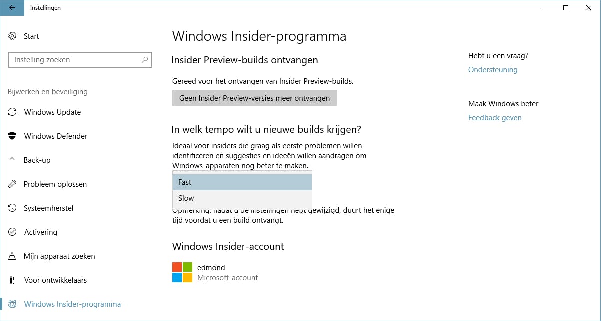 Ben je al Windows Insider, dan ziet het vorige scherm er iets anders uit. Zodra je de eerste Slow of Fast-build op de pc hebt staan, kun je niet meer kiezen voor de Release Preview. Je kunt dan alleen nog wisselen tussen Slow en Fast. In de laatste Fast-build was het menu bovendien alleen nog maar in het Engels en was de keuze What pace do you want to get new builds? / Slow of Fast.