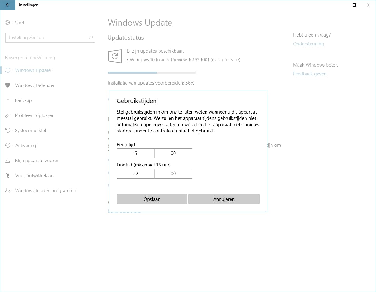 Microsoft verspreidt de nieuwe builds via Windows Update, net als alle kleine updates dus. Bovendien wordt zonder dat je dat merkt eerst de hele nieuwe Windows Insider-build gedownload en pas dan krijg je de melding dat je kunt upgraden. Hoewel je vooral veel moet wachten, is het verstandig de instellingen van Windows Update aan te passen voor de tijden waarop het nieuwe versies mag installeren. Klik op Start / Instellingen / Bijwerken en beveiliging / Windows Update. Kies nu onder Instellingen voor updates voor Gebruikstijden wijzigen. Hier kun je aangeven tussen welke Begintijd en Eindtijd je de computer gebruikt en je zeker niet (!) wilt dat de computer opnieuw opstart om een nieuwe versie te installeren. Stel jouw tijden in en bevestig met Opslaan. Onder Opties voor opnieuw opstarten en Geavanceerde opties vind je nog meer opties om het installeren van updates en de reboot te sturen. Overigens is een Insider-build is een volledige herinstallatie die wel een uur of langer kan duren, en in de tussentijd kun je de computer niet gewoon gebruiken!